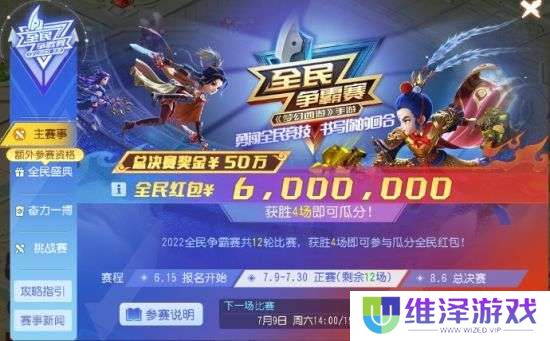 若你想要勇闯本次全民争霸赛,不妨先熟悉一下相关的赛程吧。本届比赛共设置十二轮正赛,从7月9日起至7月30日的每周六将进行3轮比赛,其中,14:00和15:30轮次将供玩家直接参与,而17:00轮次的正赛则需要战队成员共同完成周活跃任务方可获得参与资格。
