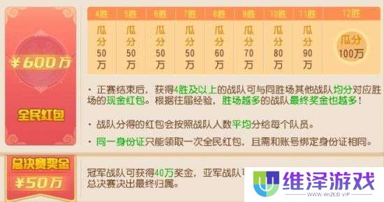 在全部正赛结束后,获得4胜或以上的战队可与同胜场的其他战队均分对应胜场的现金红包。而根据往届经验,胜场越多的战队,最终得到的奖励也将越多哦!而在整整十二轮正赛中取得优异成绩的战队,还将获得8月6日全民争霸赛总决赛的参与资格,争夺最高40万的冠军现金大奖,或10万人民币的亚军奖金!