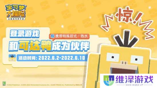 可达鸭这段时间可谓是当之无愧的“顶流”宝可梦,抢不到玩具不要紧,《宝可梦大探险》免费送!6月2日至6月10日活动期间,只需探险家们登录游戏,就能把人气明星可达鸭带回家!值得一提的是,这次的可达鸭自带特殊招式·热水,战力极高,一定能成为探险家队伍里的中流砥柱!