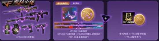 而6月11日至6月17日期间,CFer游戏1局后则将获得CFS2017纪念套装,成功召回好友则有雪域电竞-CFPLS2冠军喷图及1枚CFPL10周年币相赠。如果CFer持续参与本次CFPL十周年系列活动,并成功收集10枚周年币,即可在9月开启的对应活动中获得全新击杀图标套装的奖励。