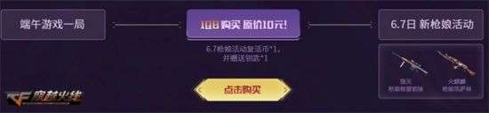 在端午佳节当天,端午福利风暴升级,游戏一局最多可领4件稀有道具,其中有稀有英雄级Barrett-朱雀,稀有玩偶敖丙,非期限版本的特殊收纳包,以及限时返场的京剧背包,M200 Cheytac-大圣等,游戏1局还可额外拥有1元购买6.7枪娘活动复活币*1+钥匙*1的惊喜回馈。6月7日前往参与活动将有机会获得枪娘格雷姐妹或枪娘凯萨林的助力,将强力武器道具收入囊中。