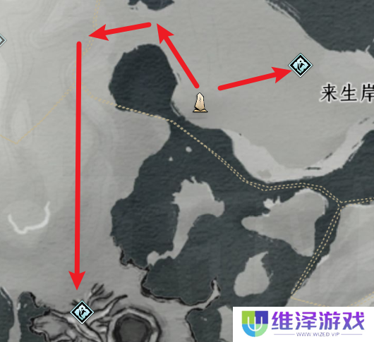来生岸附近有2个蹊跷可收集,位置与路线图如下。
