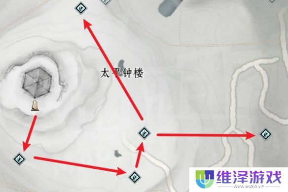太平钟楼附近有5个蹊跷可收集,位置与路线图如下。