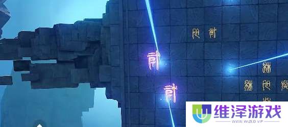 击败本关的敌人后,会出现光束机关,操作和上面紫色一致,利用光束激活平台的文字。