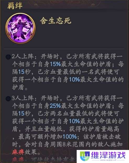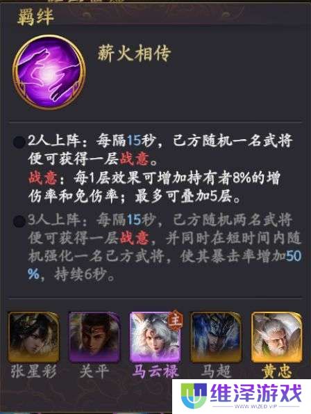 该阵容由典韦,马云禄,庞德,魏延,曹仁组成,在前期此阵容搭配算是比较容易凑齐的,前排抗伤首选典韦,曹仁,魏延三名武将,因为有舍生忘死羁绊,朝气蓬勃、侵掠入火效果使己方所有武将获得一个相当于自身血量25%的护盾,附带**效果可以在攻击时有50%几率让状态持有者攻击落空,朝气蓬勃附带的一层战意增加8%的增伤率和免伤率最多5层,侵掠入火可以给典韦,魏延附带吸血增加25%,在保证前排抗伤的同时又能充分保证续航能力在合适不过,后排由马云禄,庞德两名武将进行突进对方武将后排远程武将,后排武将带有羁绊动如雷震,可以让爆发职业武将获得3秒的增伤率增加33%。在此阵容搭配下,首日主线任务推图能够达到8-3的关卡,战力可以达到7万左右,主公等级能够提升至22级。