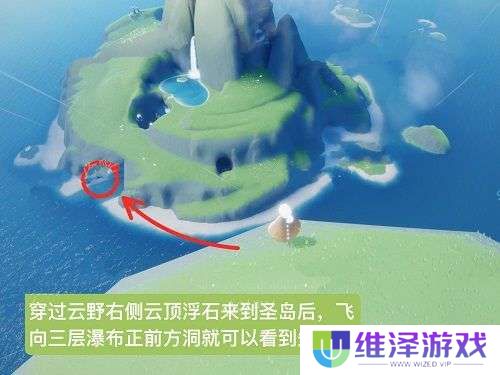 1、穿过云野右侧云顶浮石来到圣岛后,飞向三层瀑布正前方洞就可以看到先祖了。