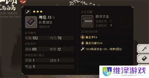 该剑法的特殊效果是每次攻击时,有5%的概率降低敌人攻击数值,最高可以降低敌人的攻击力29点,几乎让敌人失去攻击能力。