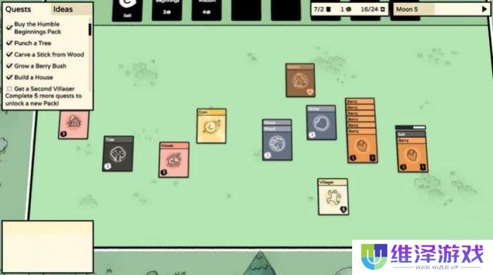 游戏**114张卡牌,分为人与地点(12张),生物(12张),食物(16张),建筑(16张),资源(14张)几类,所有卡牌可以卖掉收获金币,而金币可以用来抽不同卡包:基础资源包(钥匙和泥土),灵感包(合成指南),探索包(地图区域,如森林、平原、古村)等,本作的主要乐趣是抽卡,由于资源积攒很快,玩家可以迅速购买卡包实现抽卡永动机,虽然偶尔也会有老鼠之类的小惊吓,不过大部分卡包还是稳赚不亏。