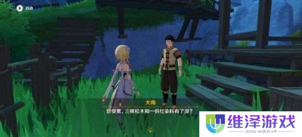 到达轻策庄找到「路爷」后与其对话,过剧情,剧情过后「大雨」让寻找三根松木和一份红颜料并交给他。
